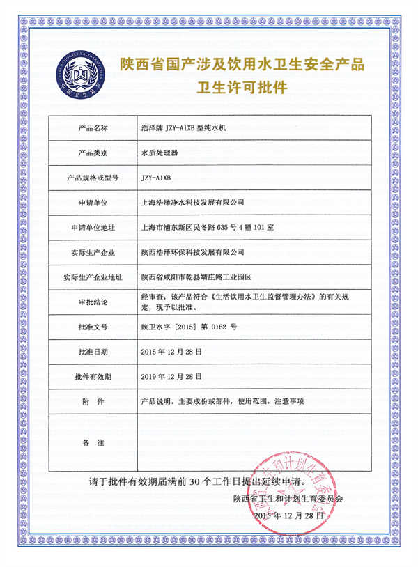浩泽产品 更多>> 中国国家强制性产品认证证书 净水器质量与净化功能认证证书 净水器产品认证 净化器质量与净化功能认证证书 浩泽牌JZY-A1XB型涉水批件(陕卫水字) 浩泽牌JZY-A1XB2型涉水批件1(陕卫水字)(1)_00 福布斯中国潜力企业 服务创新奖 发证通知书 SGS认证证书 ISO9001认证 IEC认证 CE认证 产品认证证书 NSF证书